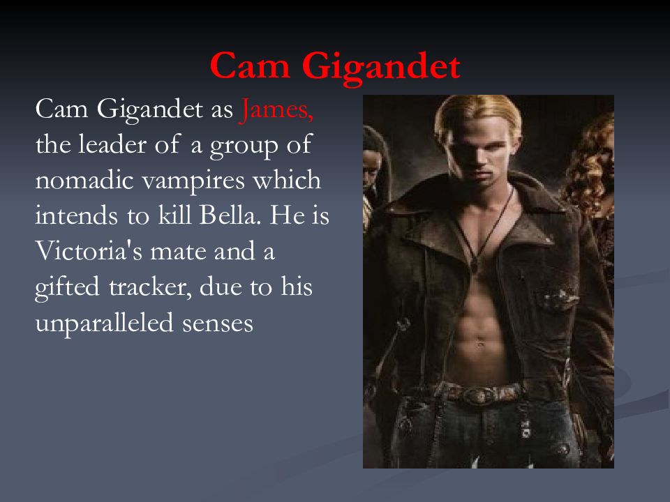Cam Gigandet as James, the leader of a group of nomadic vampires which intends to kill Bella. He is Victoria's mate and a gifted tracker, due to his unparalleled senses