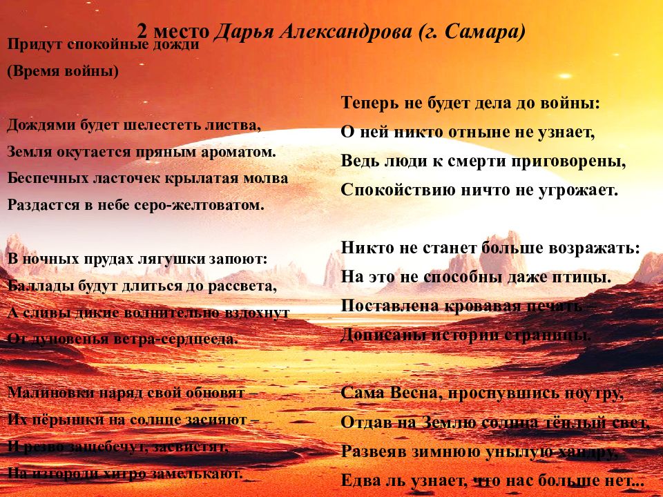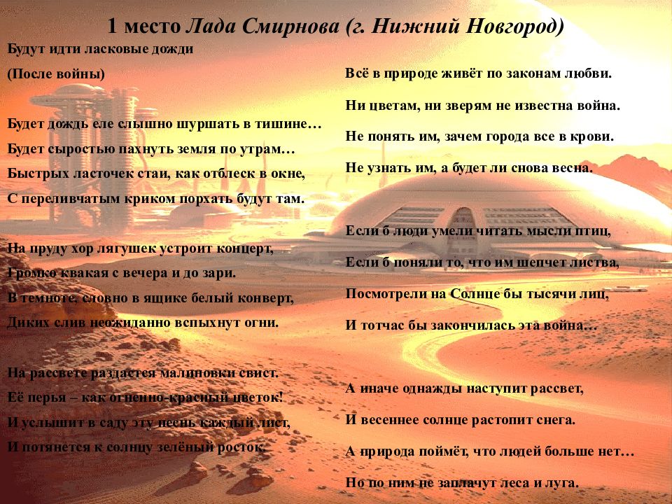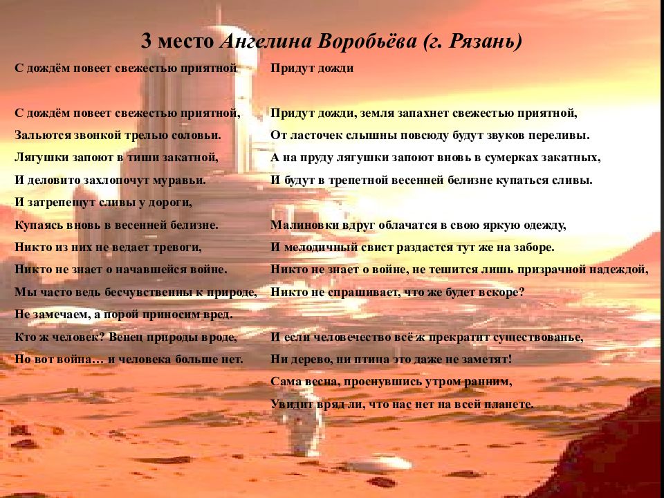С дождём повеет свежестью приятной С дождём повеет свежестью приятной, Зальются звонкой трелью соловьи. Лягушки запоют в тиши закатной, И деловито захлопочут муравьи. И затрепещут сливы у дороги, Купаясь вновь в весенней белизне. Никто из них не ведает тревоги, Никто не знает о начавшейся войне. Мы часто ведь бесчувственны к природе, Не замечаем, а порой приносим вред. Кто ж человек? Венец природы вроде, Но вот война… и человека больше нет. Придут дожди Придут дожди, земля запахнет свежестью приятной, От ласточек слышны повсюду будут звуков переливы. А на пруду лягушки запоют вновь в сумерках закатных, И будут в трепетной весенней белизне купаться сливы. Малиновки вдруг облачатся в свою яркую одежду, И мелодичный свист раздастся тут же на заборе. Никто не знает о войне, не тешится лишь призрачной надеждой, Никто не спрашивает, что же будет вскоре ? И если человечество всё ж прекратит существованье, Ни дерево, ни птица это даже не заметят! Сама весна, проснувшись утром ранним, Увидит вряд ли, что нас нет на всей планете.