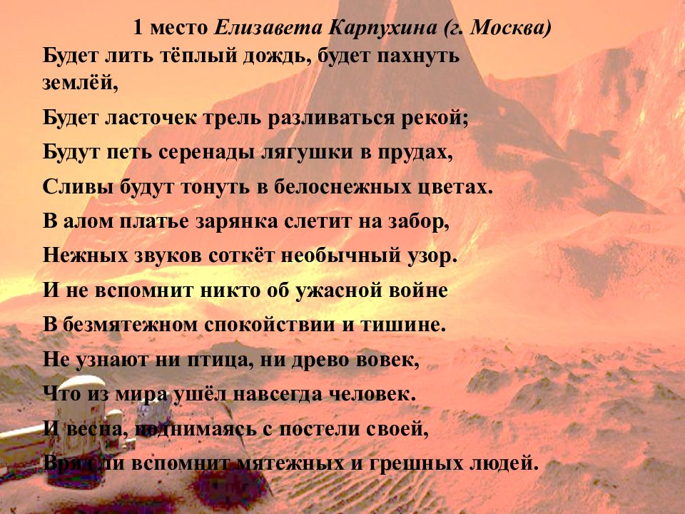 Будет лить тёплый дождь, будет пахнуть землёй, Будет ласточек трель разливаться рекой; Будут петь серенады лягушки в прудах, Сливы будут тонуть в белоснежных цветах. В алом платье зарянка слетит на забор, Нежных звуков соткёт необычный узор. И не вспомнит никто об ужасной войне В безмятежном спокойствии и тишине. Не узнают ни птица, ни древо вовек, Что из мира ушёл навсегда человек. И весна, поднимаясь с постели своей, Вряд ли вспомнит мятежных и грешных людей.