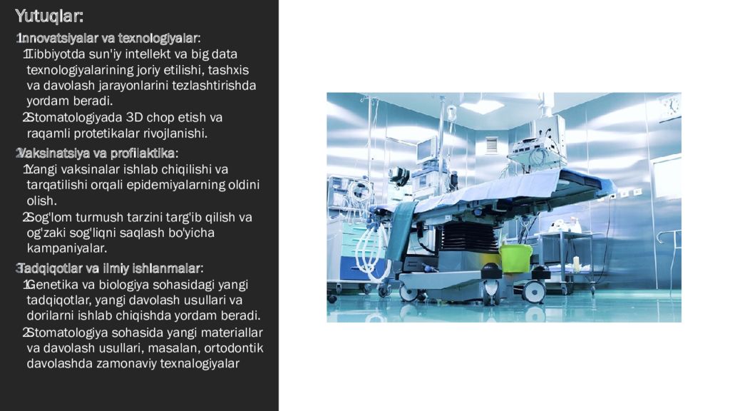Yutuqlar: Innovatsiyalar va texnologiyalar : Tibbiyotda sun'iy intellekt va big data texnologiyalarining joriy etilishi, tashxis va davolash jarayonlarini tezlashtirishda yordam beradi. Stomatologiyada 3D chop etish va raqamli protetikalar rivojlanishi. Vaksinatsiya va profilaktika : Yangi vaksinalar ishlab chiqilishi va tarqatilishi orqali epidemiyalarning oldini olish. Sog'lom turmush tarzini targ'ib qilish va og'zaki sog'liqni saqlash bo'yicha kampaniyalar. Tadqiqotlar va ilmiy ishlanmalar : Genetika va biologiya sohasidagi yangi tadqiqotlar, yangi davolash usullari va dorilarni ishlab chiqishda yordam beradi. Stomatologiya sohasida yangi materiallar va davolash usullari, masalan, ortodontik davolashda zamonaviy texnalogiyalar