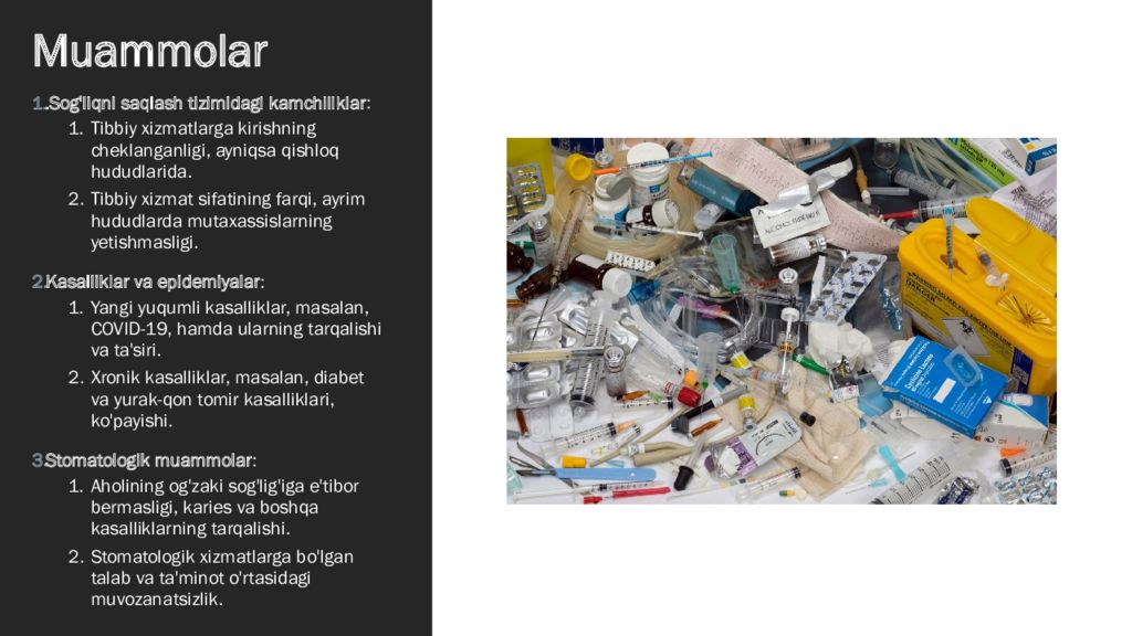 Muammolar . Sog'liqni saqlash tizimidagi kamchiliklar : Tibbiy xizmatlarga kirishning cheklanganligi, ayniqsa qishloq hududlarida. Tibbiy xizmat sifatining farqi, ayrim hududlarda mutaxassislarning yetishmasligi. Kasalliklar va epidemiyalar : Yangi yuqumli kasalliklar, masalan, COVID-19, hamda ularning tarqalishi va ta'siri. Xronik kasalliklar, masalan, diabet va yurak-qon tomir kasalliklari, ko'payishi. Stomatologik muammolar : Aholining og'zaki sog'lig'iga e'tibor bermasligi, karies va boshqa kasalliklarning tarqalishi. Stomatologik xizmatlarga bo'lgan talab va ta'minot o'rtasidagi muvozanatsizlik.
