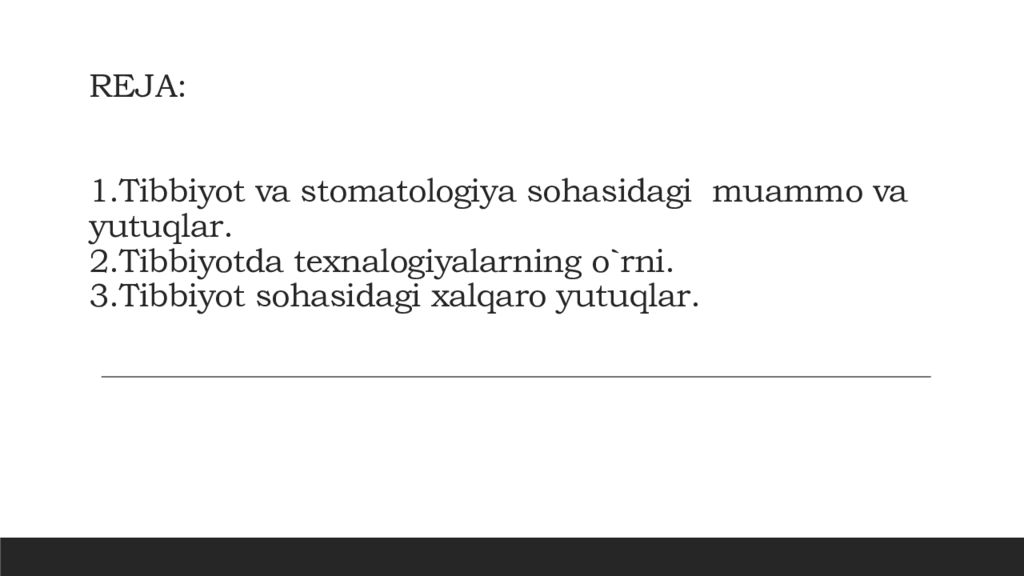 Слайд 2: REJA: 1.Tibbiyot va stomatologiya sohasidagi muammo va yutuqlar. 2.Tibbiyotda texnalogiyalarning o`rni. 3.Tibbiyot sohasidagi xalqaro yutuqlar
