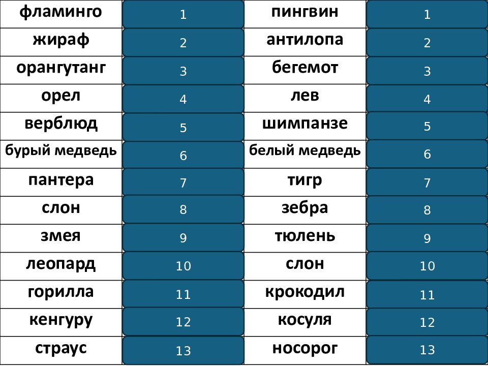 фламинго der Flamingo пингвин der Pinguin жираф die Giraffe антилопа die Antilope орангутанг der Orang-Utan бегемот das Nilpferd орел der Adler лев der Löwe верблюд das Kamel шимпанзе der Schimpanse бурый медведь der Braunbär белый медведь der Eisbär пантера der Panther тигр der Tiger слон der Elefant зебра das Zebra змея die Schlange тюлень die Robbe леопард der Leopard слон der Elefant горилла der Gorilla крокодил das Krokodil кенгуру das Känguru косуля das Reh страус der Strauß носорог das Nashorn 1 2 3 4 5 6 7 8 9 10 11 12 13 1 2 3 4 5 6 7 8 9 10 11 12 13