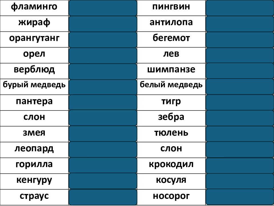фламинго der Flamingo пингвин der Pinguin жираф die Giraffe антилопа die Antilope орангутанг der Orang-Utan бегемот das Nilpferd орел der Adler лев der Löwe верблюд das Kamel шимпанзе der Schimpanse бурый медведь der Braunbär белый медведь der Eisbär пантера der Panther тигр der Tiger слон der Elefant зебра das Zebra змея die Schlange тюлень die Robbe леопард der Leopard слон der Elefant горилла der Gorilla крокодил das Krokodil кенгуру das Känguru косуля das Reh страус der Strauß носорог das Nashorn