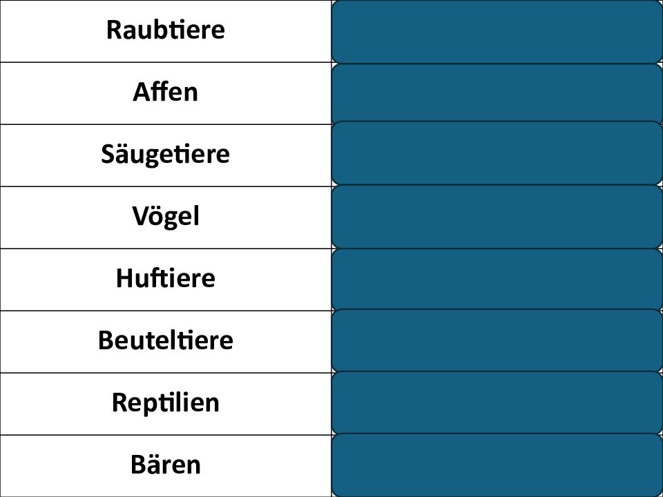 Raubtiere хищники Affen обезьяны Säugetiere млекопитающие Vögel птицы Huftiere копытные Beuteltiere сумчатые Reptilien пресмыкающиеся Bären медведи