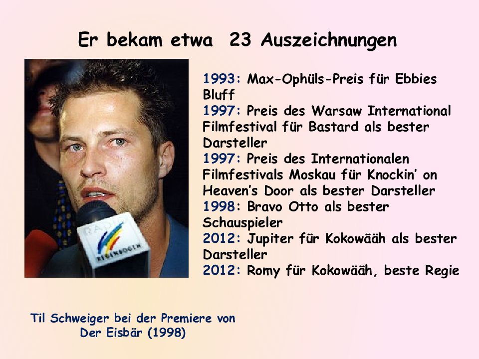 Er bekam etwa 23 Auszeichnungen Til Schweiger bei der Premiere von Der Eisbär (1998) 1993: Max-Ophüls-Preis für Ebbies Bluff 1997: Preis des Warsaw International Filmfestival für Bastard als bester Darsteller 1997: Preis des Internationalen Filmfestivals Moskau für Knockin ’ on Heaven’s Door als bester Darsteller 1998 : Bravo Otto als bester Schauspieler 2012: Jupiter für Kokowääh als bester Darsteller 2012: Romy für Kokowääh, beste Regie