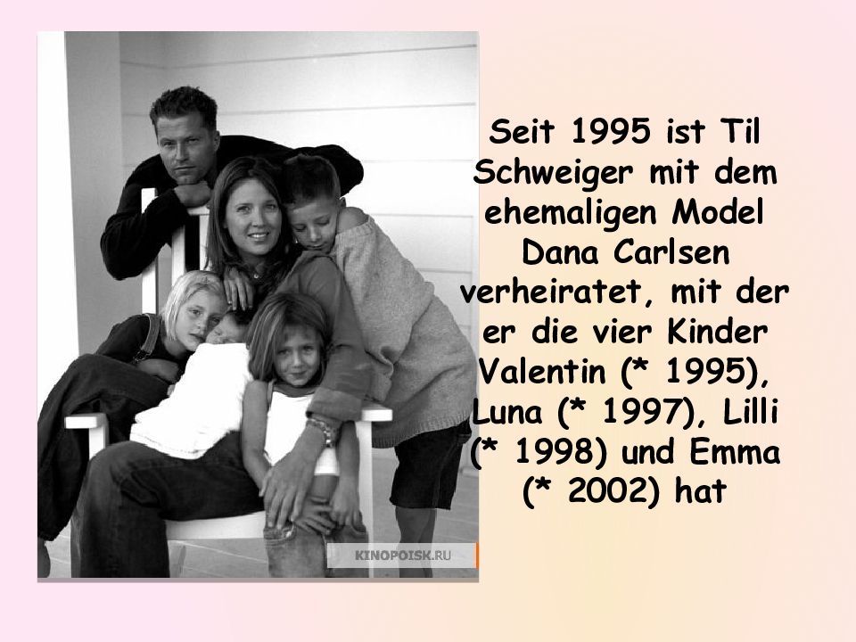 Seit 1995 ist Til Schweiger mit dem ehemaligen Model Dana Carlsen verheiratet, mit der er die vier Kinder Valentin (* 1995), Luna (* 1997), Lilli (* 1998) und Emma (* 2002) hat