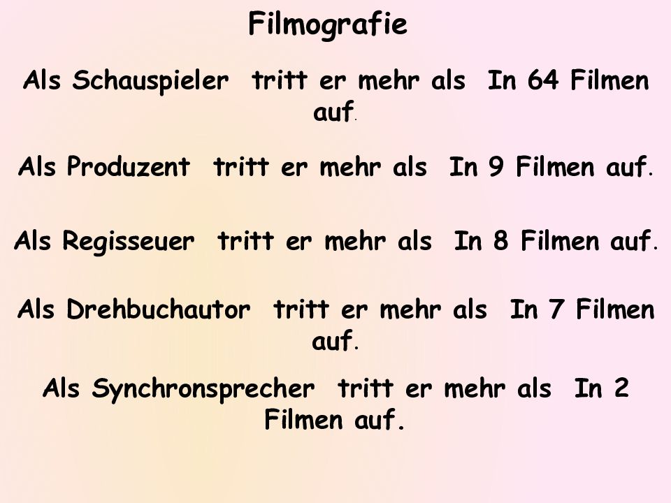 Filmografie Als Schauspieler tritt er mehr als In 64 Filmen auf. Als Produzent tritt er mehr als In 9 Filmen auf. Als Regisseuer tritt er mehr als In 8 Filmen auf. Als Drehbuchautor tritt er mehr als In 7 Filmen auf. Als Synchronsprecher tritt er mehr als In 2 Filmen auf.