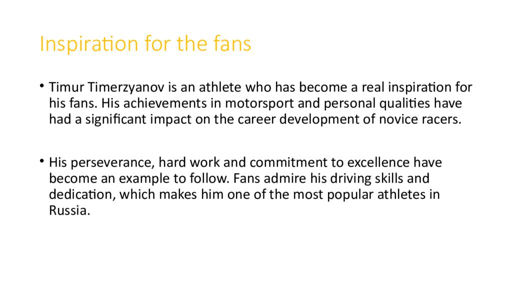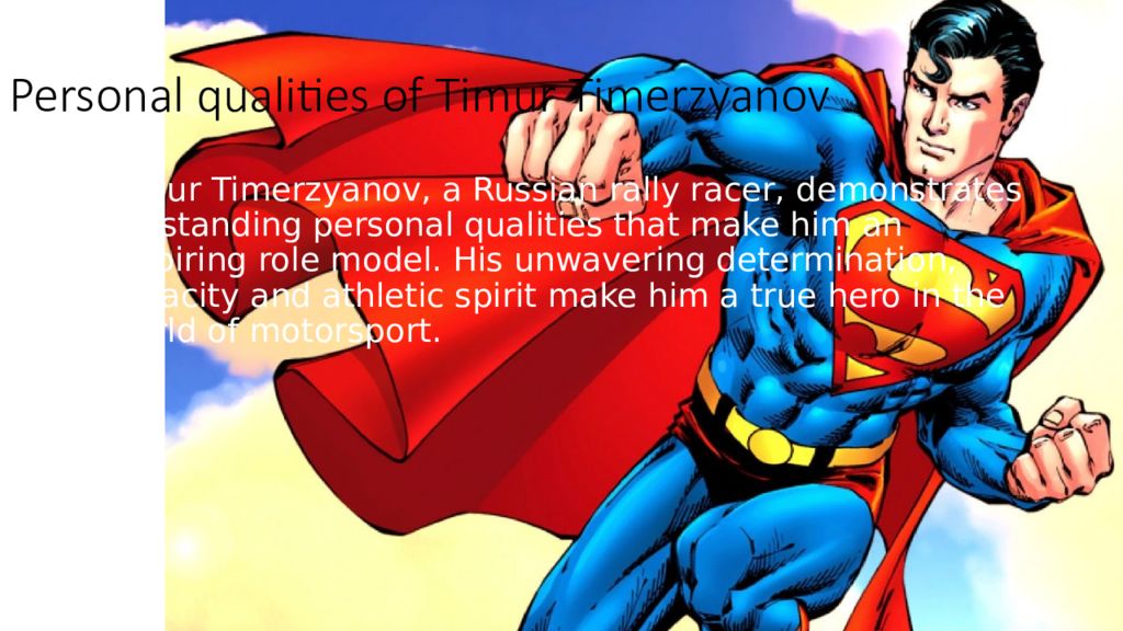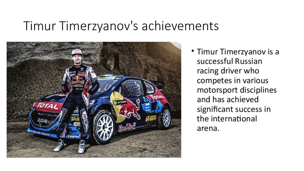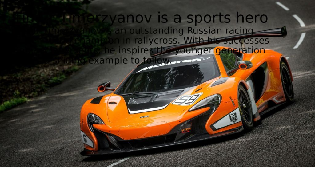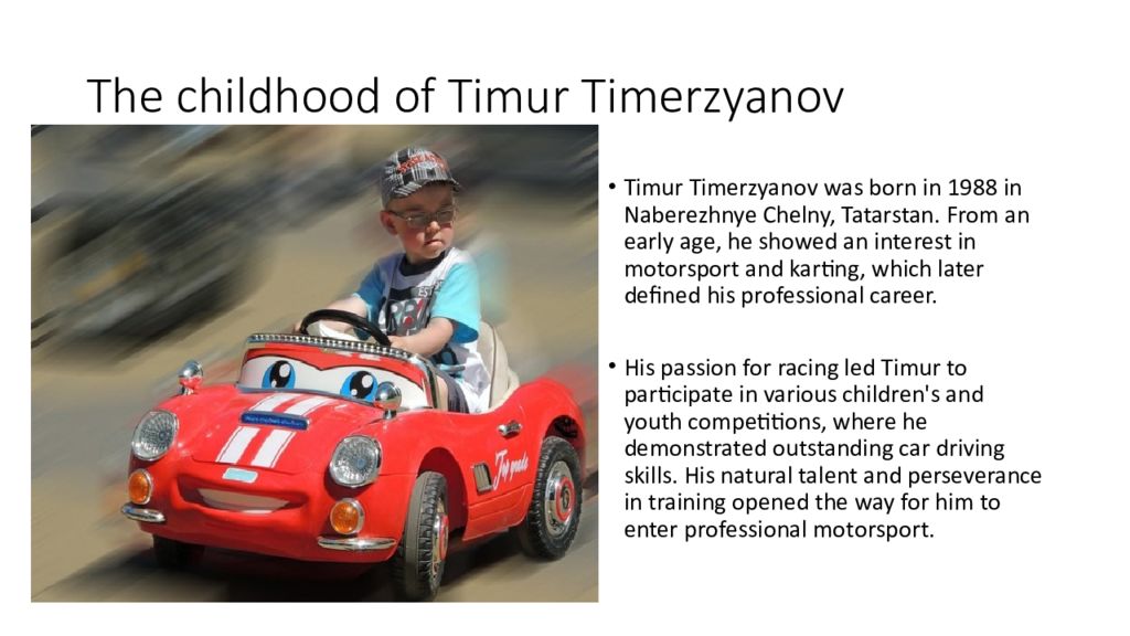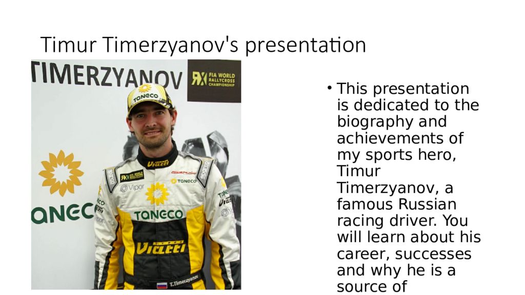 This presentation is dedicated to the biography and achievements of my sports hero, Timur Timerzyanov, a famous Russian racing driver. You will learn about his career, successes and why he is a source of inspiration for me.