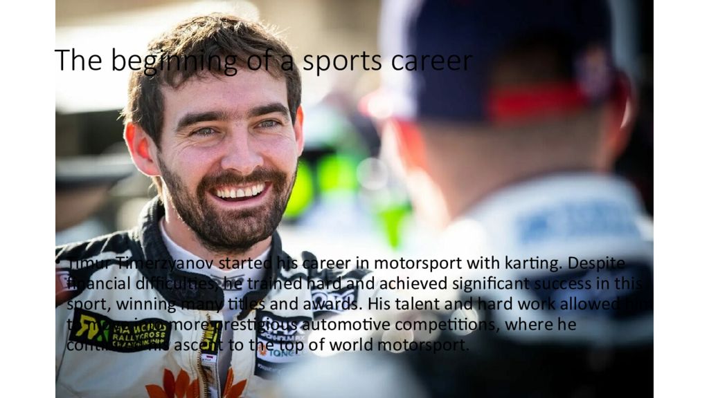Слайд 7: Timur Timerzyanov is a sports hero Timur Timerzyanov is an outstanding Russian racing driver, world champion in rallycross. With his successes and achievements, he inspires the younger generation and is a shining example to follow