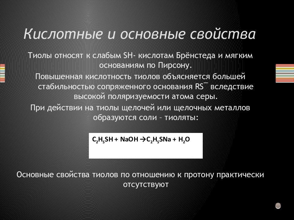 Тиолы относят к слабым SH- кислотам Брёнстеда и мягким основаниям по Пирсону. Повышенная кислотность тиолов объясняется большей стабильностью сопряженного основания RS¯ вследствие высокой поляризуемости атома серы. При действии на тиолы щелочей или щелочных металлов образуются соли – тиоляты : Основные свойства тиолов по отношению к протону практически отсутствуют C 2 H 5 SH + NaOH →C 2 H 5 SNa + H 2 O