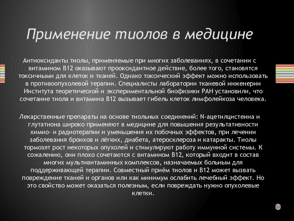 Антиоксиданты тиолы, применяемые при многих заболеваниях, в сочетании с витамином В12 оказывают прооксидантное действие, более того, становятся токсичными для клеток и тканей. Однако токсический эффект можно использовать в противоопухолевой терапии. Специалисты лаборатории тканевой инженерии Института теоретической и экспериментальной биофизики РАН установили, что сочетание тиола и витамина В12 вызывает гибель клеток лимфолейкоза человека. Лекарственные препараты на основе тиольных соединений: N- ацетилцистеина и глутатиона широко применяют в медицине для повышения результативности химио - и радиотерапии и уменьшения их побочных эффектов, при лечении заболевания бронхов и лёгких, диабета, атеросклероза и катаракты. Тиолы тормозят рост некоторых опухолей и стимулируют работу иммунной системы. К сожалению, они плохо сочетаются с витамином В12, который входит в состав многих мультивитаминных комплексов, назначаемых больным для поддерживающей терапии. Совместный приём тиолов и В12 может вызвать повреждение тканей и органов или как минимум ослабить лечебный эффект. Но это свойство может оказаться полезным, если повреждать нужно опухолевые клетки.