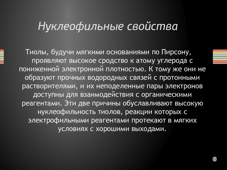 Тиолы, будучи мягкими основаниями по Пирсону, проявляют высокое сродство к атому углерода с пониженной электронной плотностью. К тому же они не образуют прочных водородных связей с протонными растворителями, и их неподеленные пары электронов доступны для взаимодействия с органическими реагентами. Эти две причины обуславливают высокую нуклеофильность тиолов, реакции которых с электрофильными реагентами протекают в мягких условиях с хорошими выходами.
