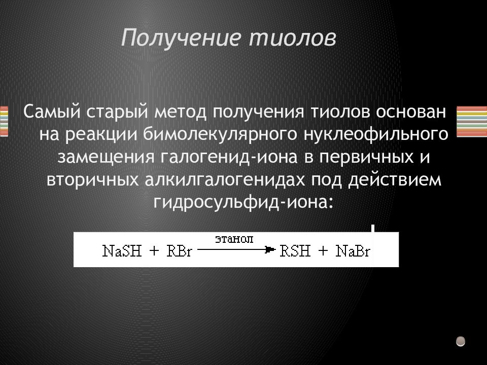 Самый старый метод получения тиолов основан на реакции бимолекулярного нуклеофильного замещения галогенид-иона в первичных и вторичных алкилгалогенидах под действием гидросульфид-иона :