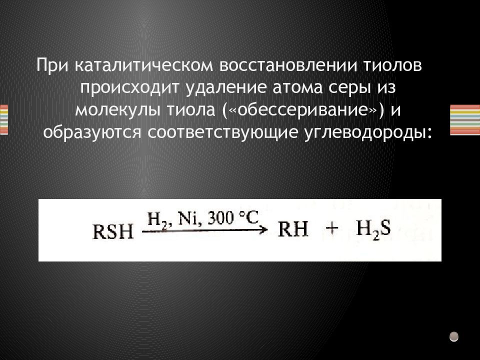 При каталитическом восстановлении тиолов происходит удаление атома серы из молекулы тиола (« обессеривание ») и образуются соответствующие углеводороды: