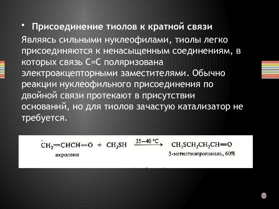 Присоединение тиолов к кратной связи Являясь сильными нуклеофилами, тиолы легко присоединяются к ненасыщенным соединениям, в которых связь С=С поляризована электроакцепторными заместителями. Обычно реакции нуклеофильного присоединения по двойной связи протекают в присутствии оснований, но для тиолов зачастую катализатор не требуется.
