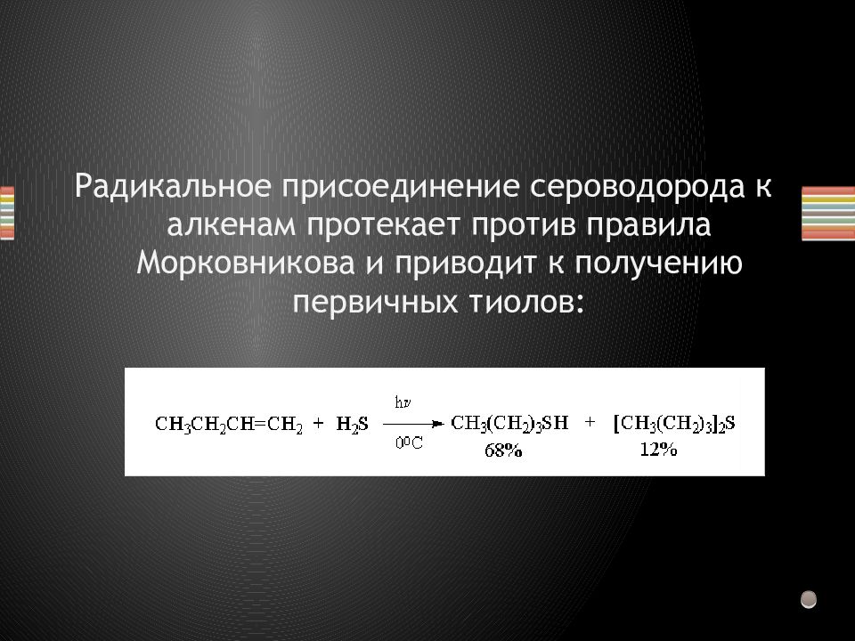 Радикальное присоединение сероводорода к алкенам протекает против правила Морковникова и приводит к получению первичных тиолов :