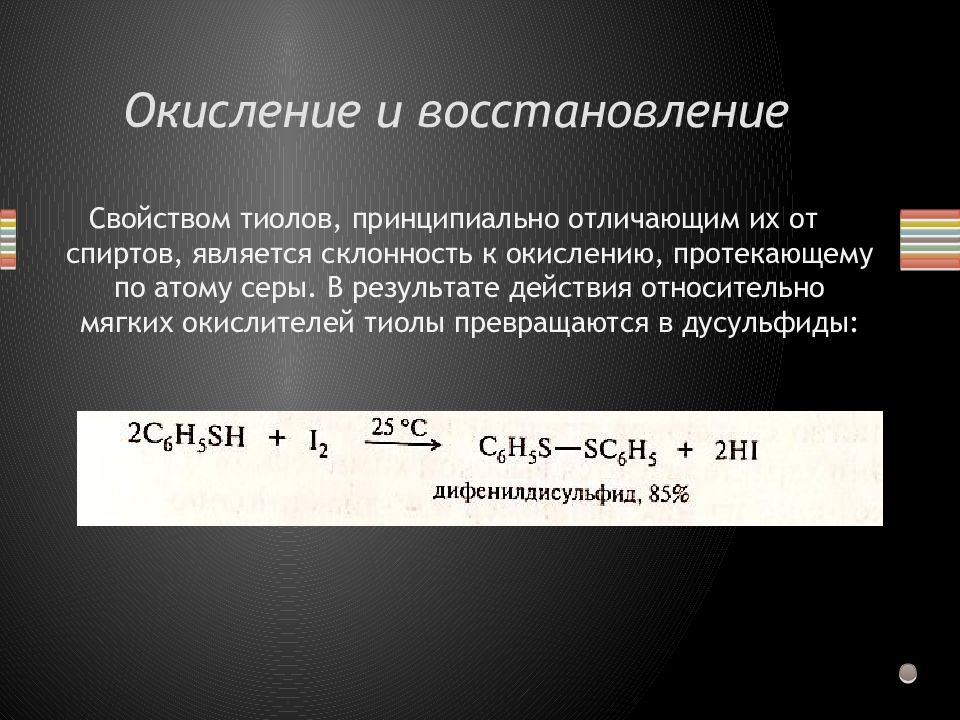 Свойством тиолов, принципиально отличающим их от спиртов, является склонность к окислению, протекающему по атому серы. В результате действия относительно мягких окислителей тиолы превращаются в дусульфиды :