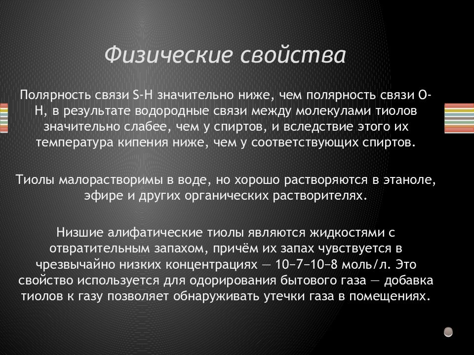 Полярность связи S-H значительно ниже, чем полярность связи O-H, в результате водородные связи между молекулами тиолов значительно слабее, чем у спиртов, и вследствие этого их температура кипения ниже, чем у соответствующих спиртов. Тиолы малорастворимы в воде, но хорошо растворяются в этаноле, эфире и других органических растворителях. Низшие алифатические тиолы являются жидкостями с отвратительным запахом, причём их запах чувствуется в чрезвычайно низких концентрациях — 10−7−10−8 моль/л. Это свойство используется для одорирования бытового газа — добавка тиолов к газу позволяет обнаруживать утечки газа в помещениях.