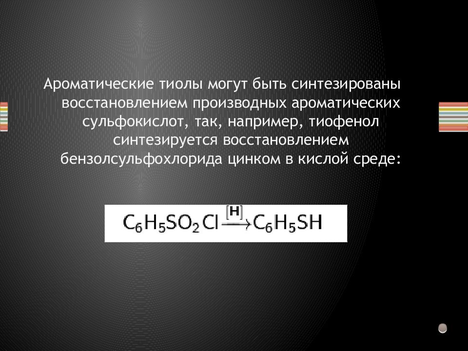 Ароматические тиолы могут быть синтезированы восстановлением производных ароматических сульфокислот, так, например, тиофенол синтезируется восстановлением бензолсульфохлорида цинком в кислой среде: