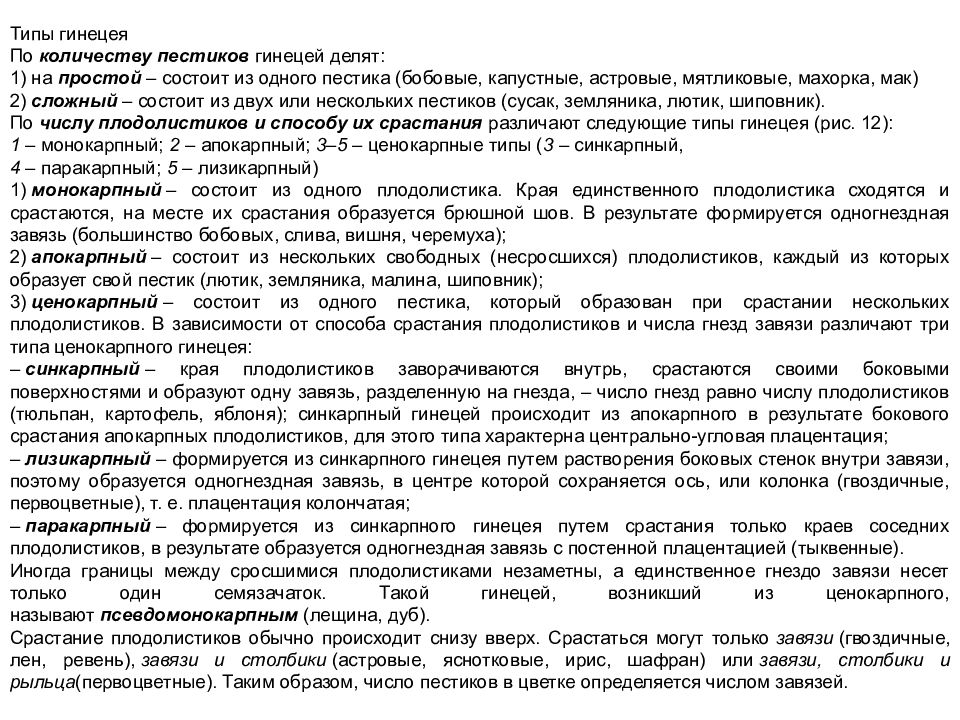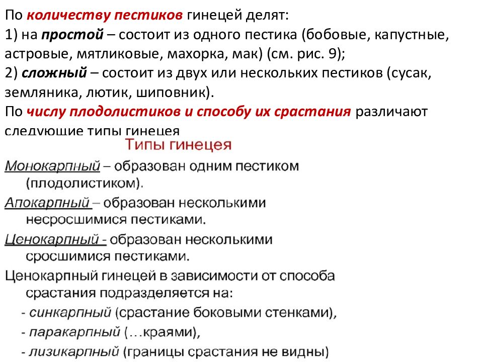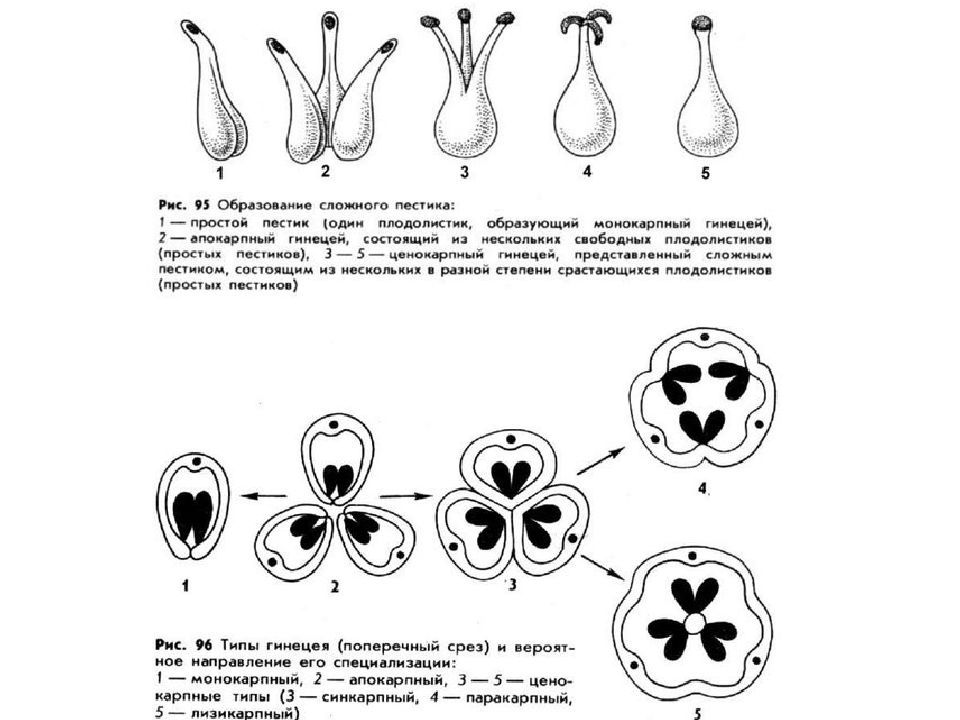 По количеству пестиков гинецей делят: 1) на простой – состоит из одного пестика (бобовые, капустные, астровые, мятликовые, махорка, мак) (см. рис. 9); 2) сложный – состоит из двух или нескольких пестиков (сусак, земляника, лютик, шиповник). По числу плодолистиков и способу их срастания различают следующие типы гинецея