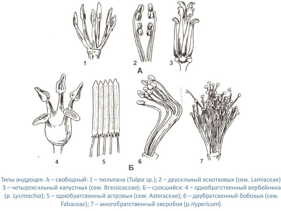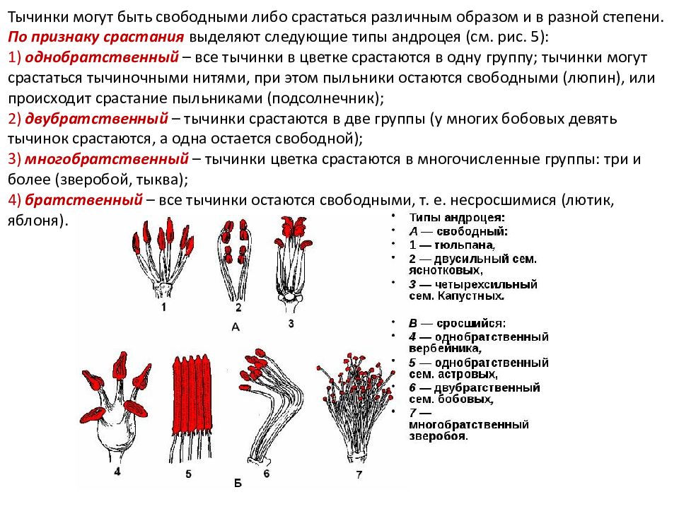 Тычинки могут быть свободными либо срастаться различным образом и в разной степени. По признаку срастания выделяют следующие типы андроцея (см. рис. 5): 1) однобратственный – все тычинки в цветке срастаются в одну группу; тычинки могут срастаться тычиночными нитями, при этом пыльники остаются свободными (люпин), или происходит срастание пыльниками (подсолнечник); 2) двубратственный – тычинки срастаются в две группы (у многих бобовых девять тычинок срастаются, а одна остается свободной); 3) многобратственный – тычинки цветка срастаются в многочисленные группы: три и более (зверобой, тыква); 4) братственный – все тычинки остаются свободными, т. е. несросшимися (лютик, яблоня).