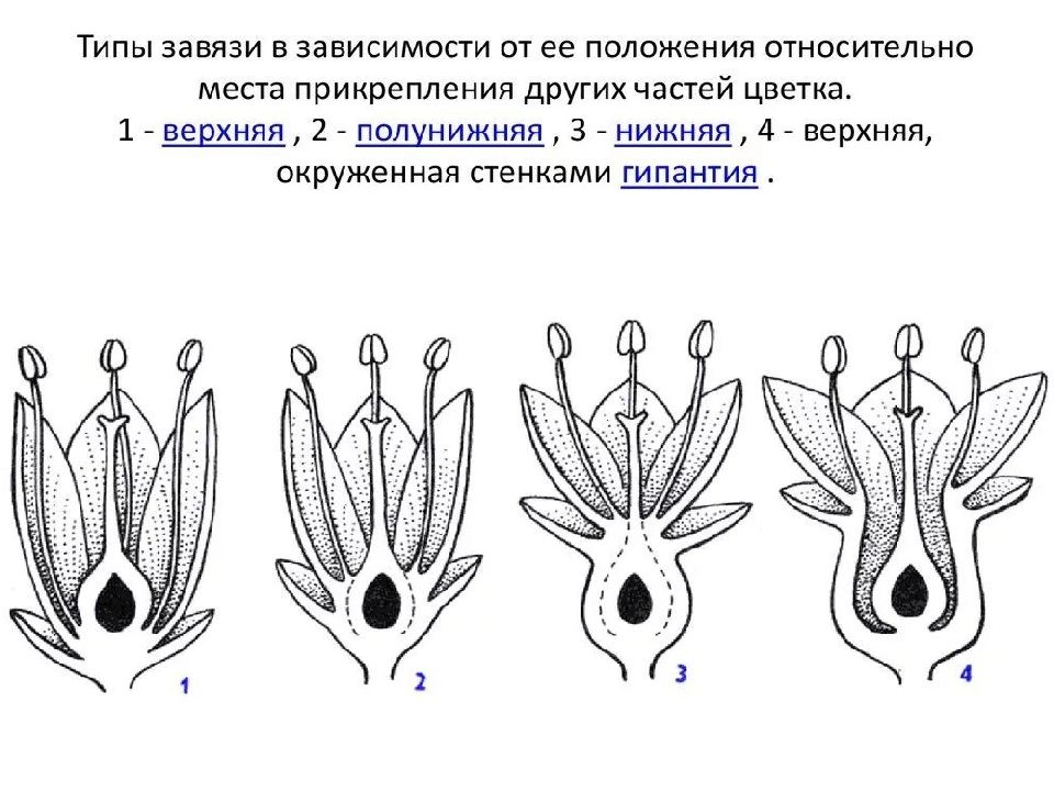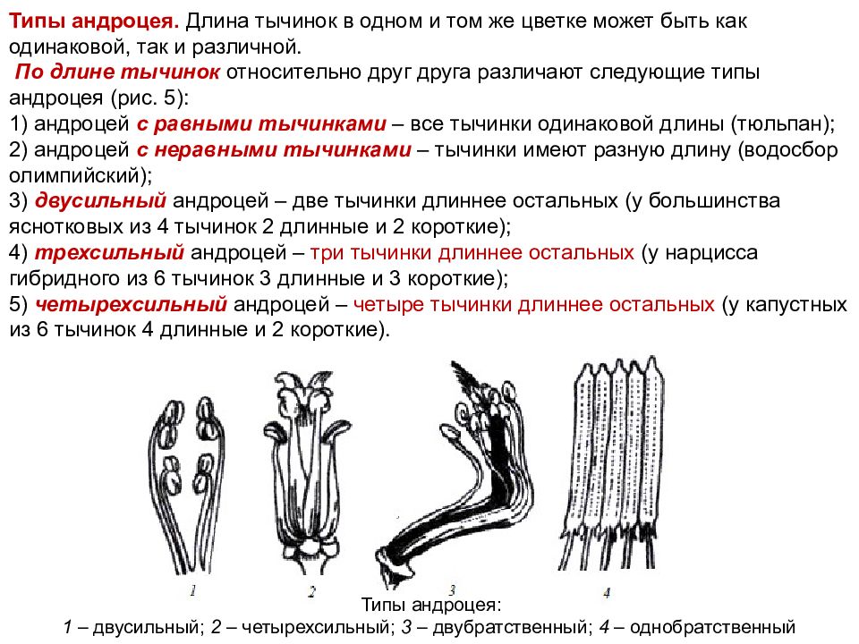 Типы андроцея. Длина тычинок в одном и том же цветке может быть как одинаковой, так и различной. По длине тычинок относительно друг друга различают следующие типы андроцея (рис. 5): 1) андроцей с равными тычинками – все тычинки одинаковой длины (тюльпан); 2) андроцей с неравными тычинками – тычинки имеют разную длину (водосбор олимпийский); 3) двусильный андроцей – две тычинки длиннее остальных (у большинства яснотковых из 4 тычинок 2 длинные и 2 короткие); 4) трехсильный андроцей – три тычинки длиннее остальных (у нарцисса гибридного из 6 тычинок 3 длинные и 3 короткие); 5) четырехсильный андроцей – четыре тычинки длиннее остальных (у капустных из 6 тычинок 4 длинные и 2 короткие). Типы андроцея: 1 – двусильный ; 2 – четырехсильный ; 3 – двубратственный ; 4 – однобратственный