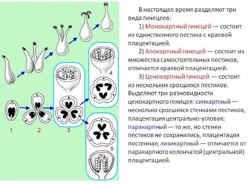 Типы гинецея По количеству пестиков гинецей делят: 1) на простой – состоит из одного пестика (бобовые, капустные, астровые, мятликовые, махорка, мак) 2) сложный – состоит из двух или нескольких пестиков (сусак, земляника, лютик, шиповник). По числу плодолистиков и способу их срастания различают следующие типы гинецея (рис. 12): 1 – монокарпный ; 2 – апокарпный; 3 – 5 – ценокарпные типы ( 3 – синкарпный, 4 – паракарпный ; 5 – лизикарпный ) 1) монокарпный – состоит из одного плодолистика. Края единственного плодолистика сходятся и срастаются, на месте их срастания образуется брюшной шов. В результате формируется одногнездная завязь (большинство бобовых, слива, вишня, черемуха); 2) апокарпный – состоит из нескольких свободных (несросшихся) плодолистиков, каждый из которых образует свой пестик (лютик, земляника, малина, шиповник); 3) ценокарпный – состоит из одного пестика, который образован при срастании нескольких плодолистиков. В зависимости от способа срастания плодолистиков и числа гнезд завязи различают три типа ценокарпного гинецея: – синкарпный – края плодолистиков заворачиваются внутрь, срастаются своими боковыми поверхностями и образуют одну завязь, разделенную на гнезда, – число гнезд равно числу плодолистиков (тюльпан, картофель, яблоня); синкарпный гинецей происходит из апокарпного в результате бокового срастания апокарпных плодолистиков, для этого типа характерна центрально-угловая плацентация ; – лизикарпный – формируется из синкарпного гинецея путем растворения боковых стенок внутри завязи, поэтому образуется одногнездная завязь, в центре которой сохраняется ось, или колонка (гвоздичные, первоцветные), т. е. плацентация колончатая; – паракарпный – формируется из синкарпного гинецея путем срастания только краев соседних плодолистиков, в результате образуется одногнездная завязь с постенной плацентацией (тыквенные). Иногда границы между сросшимися плодолистиками незаметны, а единственное гнездо завязи несет только один семязачаток. Такой гинецей, возникший из ценокарпного, называют псевдомонокарпным (лещина, дуб). Срастание плодолистиков обычно происходит снизу вверх. Срастаться могут только завязи (гвоздичные, лен, ревень), завязи и столбики (астровые, яснотковые, ирис, шафран) или завязи, столбики и рыльца (первоцветные). Таким образом, число пестиков в цветке определяется числом завязей.