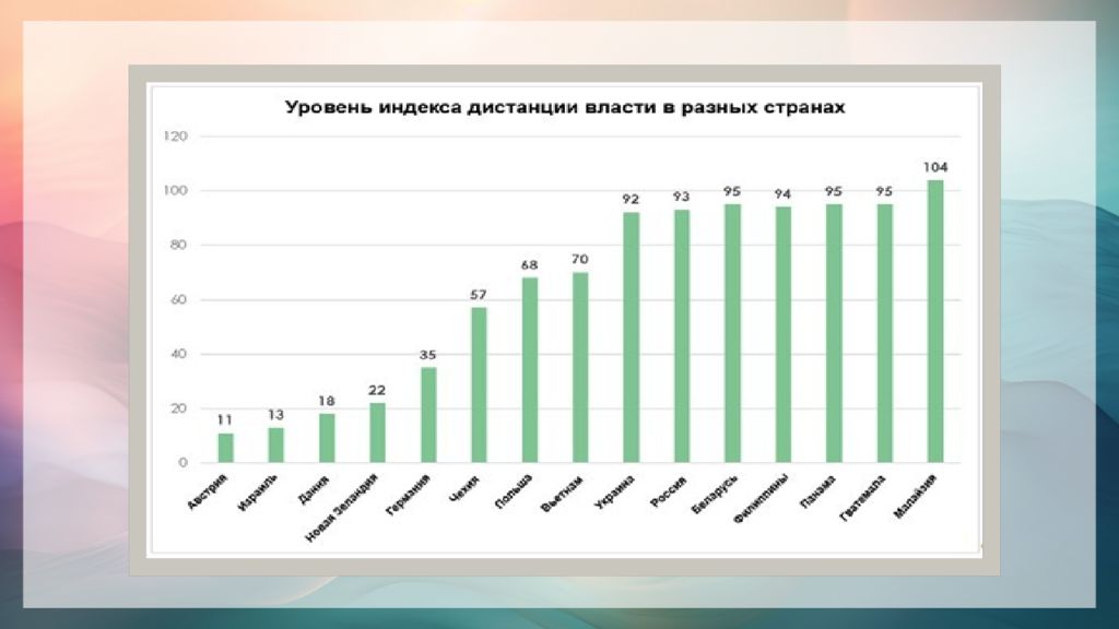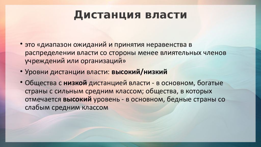 это «диапазон ожиданий и принятия неравенства в распределении власти со стороны менее влиятельных членов учреждений или организаций » Уровни дистанции власти: высокий/низкий Общества с низкой дистанцией власти - в основном, богатые страны с сильным средним классом; общества, в которых отмечается высокий уровень - в основном, бедные страны со слабым средним классом