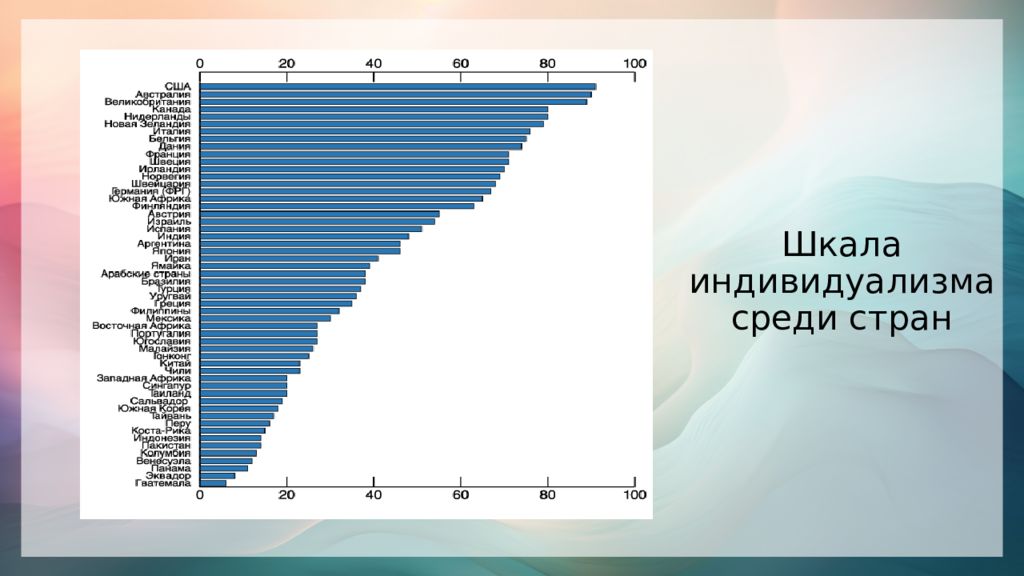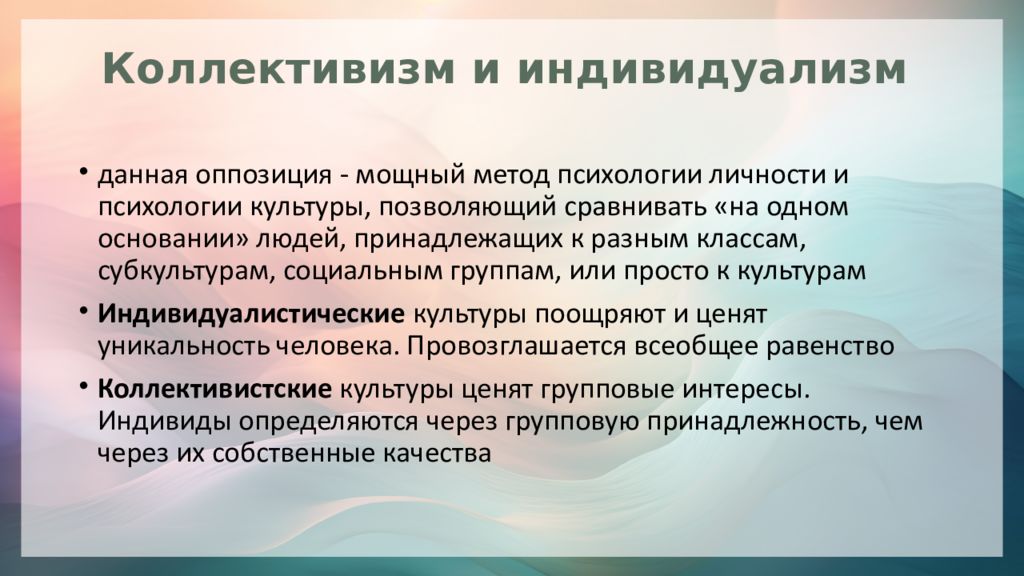 д анная оппозиция - мощный метод психологии личности и психологии культуры, позволяющий сравнивать «на одном основании» людей, принадлежащих к разным классам, субкультурам, социальным группам, или просто к культурам Индивидуалистические культуры поощряют и ценят уникальность человека. П ровозглашается всеобщее равенство Коллективистские культуры ценят групповые интересы. Индивиды определяются через групповую принадлежность, чем через их собственные качества