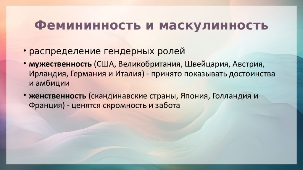 р аспределение гендерных ролей мужественность (США, Великобритания, Швейцария, Австрия, Ирландия, Германия и Италия) - принято показывать достоинства и амбиции ж енственность (скандинавские страны, Япония, Голландия и Франция) - ценятся скромность и забота