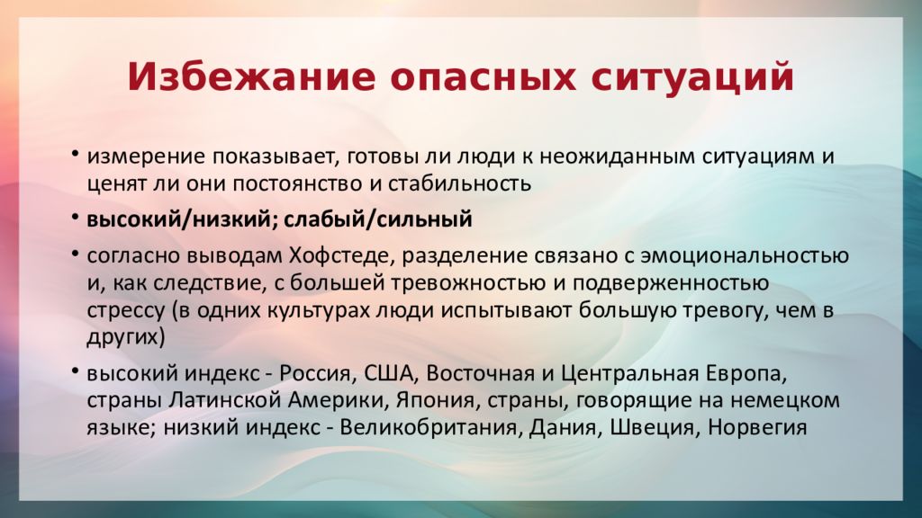 измерение показывает, готовы ли люди к неожиданным ситуациям и ценят ли они постоянство и стабильность высокий/низкий; слабый/сильный согласно выводам Хофстеде, разделение связано с эмоциональностью и, как следствие, с большей тревожностью и подверженностью стрессу (в одних культурах люди испытывают большую тревогу, чем в других) высокий индекс - Россия, США, Восточная и Центральная Европа, страны Латинской Америки, Япония, страны, говорящие на немецком языке; низкий индекс - Великобритания, Дания, Швеция, Норвегия