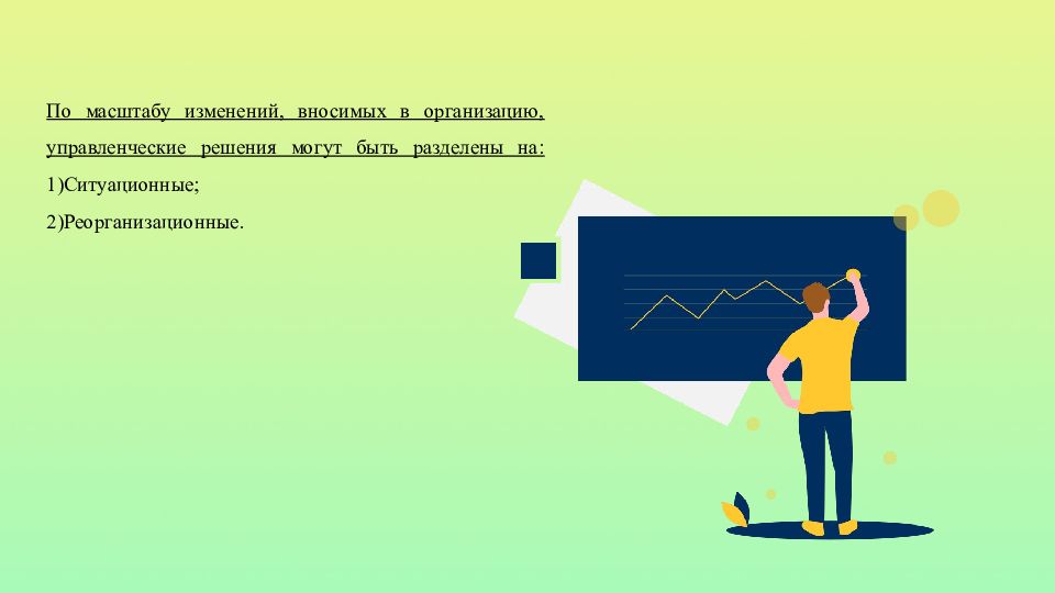 По масштабу изменений, вносимых в организацию, управленческие решения могут быть разделены на: 1)Ситуационные; 2)Реорганизационные.