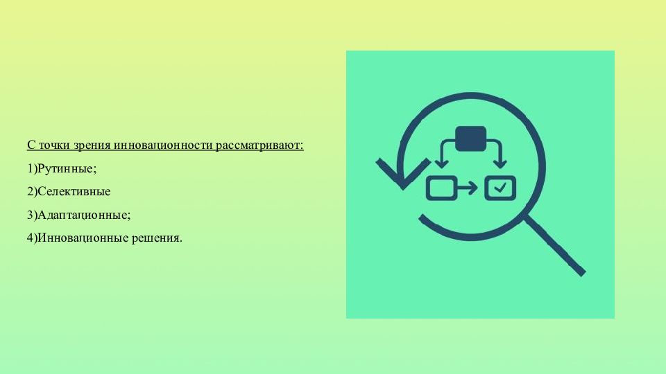 С точки зрения инновационности рассматривают: 1)Рутинные; 2)Селективные 3)Адаптационные; 4)Инновационные решения.