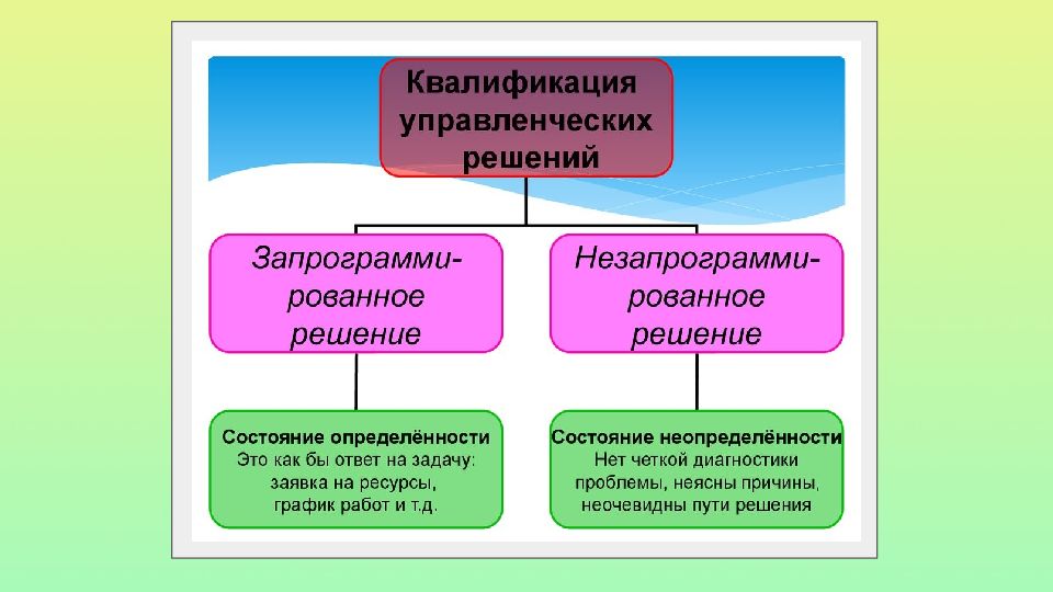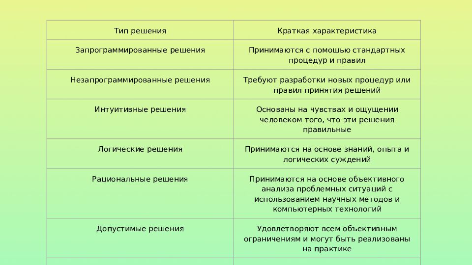 Тип решения Краткая характеристика Запрограммированные решения Принимаются с помощью стандартных процедур и правил Незапрограммированные решения Требуют разработки новых процедур или правил принятия решений Интуитивные решения Основаны на чувствах и ощущении человеком того, что эти решения правильные Логические решения Принимаются на основе знаний, опыта и логических суждений Рациональные решения Принимаются на основе объективного анализа проблемных ситуаций с использованием научных методов и компьютерных технологий Допустимые решения Удовлетворяют всем объективным ограничениям и могут быть реализованы на практике