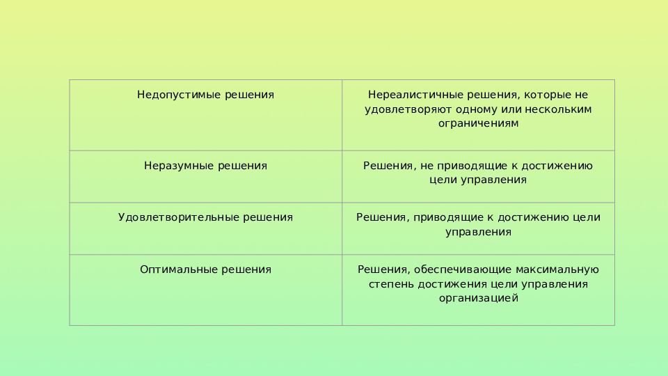 Недопустимые решения Нереалистичные решения, которые не удовлетворяют одному или нескольким ограничениям Неразумные решения Решения, не приводящие к достижению цели управления Удовлетворительные решения Решения, приводящие к достижению цели управления Оптимальные решения Решения, обеспечивающие максимальную степень достижения цели управления организацией