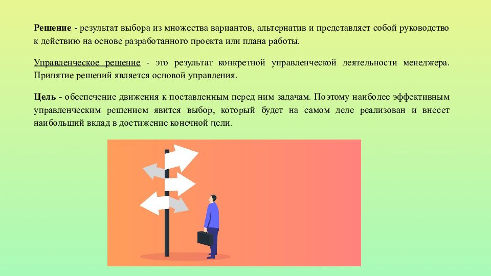 Решение - результат выбора из множества вариантов, альтернатив и представляет собой руководство к действию на основе разработанного проекта или плана работы. Управленческое решение - это результат конкретной управленческой деятельности менеджера. Принятие решений является основой управления. Цель - обеспечение движения к поставленным перед ним задачам. Поэтому наиболее эффективным управленческим решением явится выбор, который будет на самом деле реализован и внесет наибольший вклад в достижение конечной цели.
