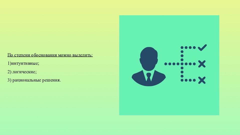 По степени обоснования можно выделить: 1)интуитивные; 2) логические; 3) рациональные решения.
