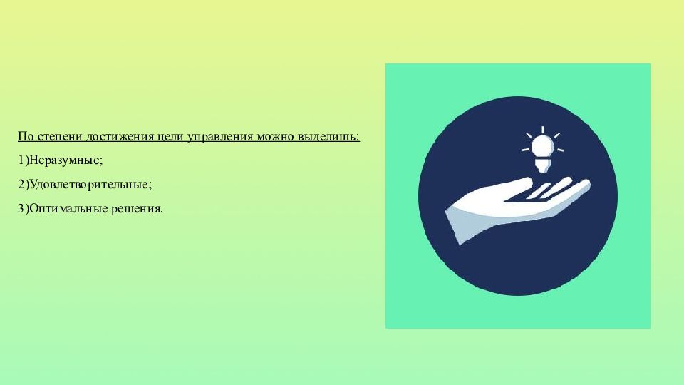 По степени достижения цели управления можно выделишь: 1)Неразумные; 2)Удовлетворительные; 3)Оптимальные решения.