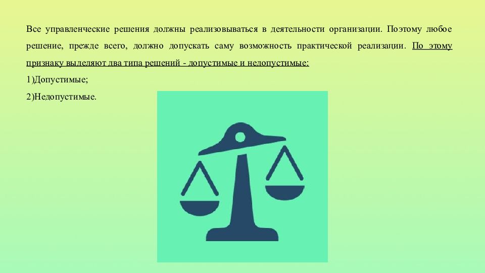 Все управленческие решения должны реализовываться в деятельности организации. Поэтому любое решение, прежде всего, должно допускать саму возможность практической реализации. По этому признаку выделяют два типа решений - допустимые и недопустимые: 1)Допустимые; 2)Недопустимые.