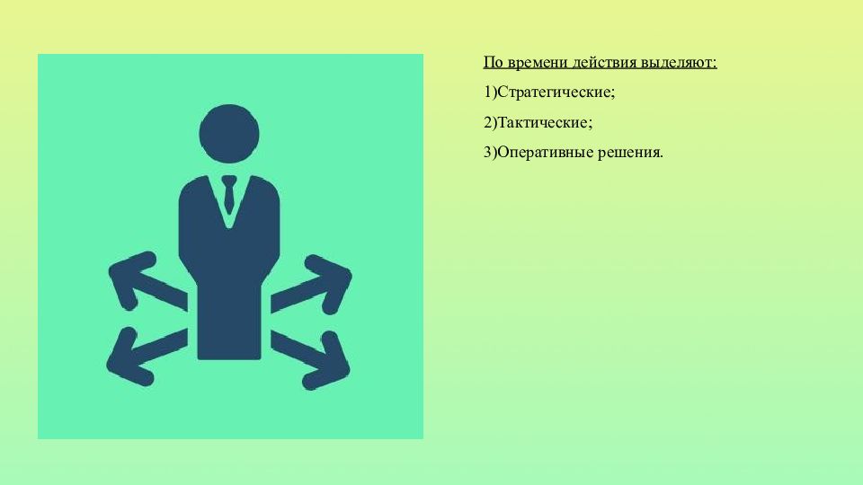 По времени действия выделяют: 1)Стратегические; 2)Тактические; 3)Оперативные решения.