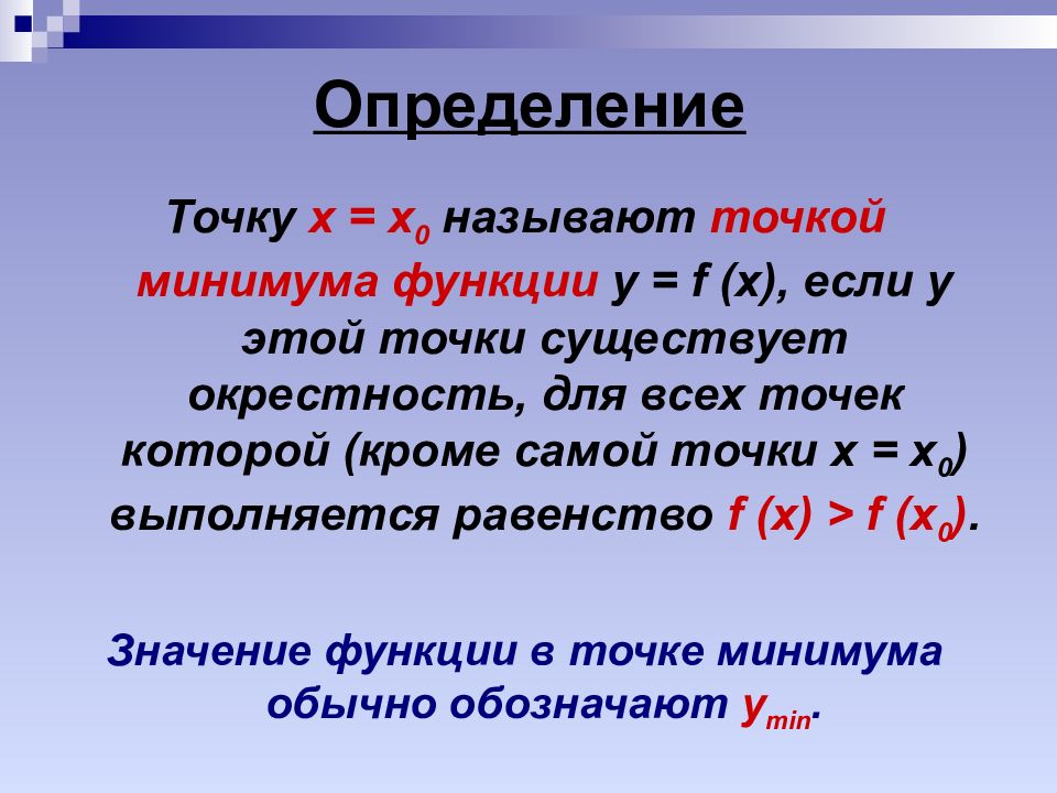 Точку x = x 0 называют точкой минимума функции y = f (x), если у этой точки существует окрестность, для всех точек которой (кроме самой точки x = x 0 ) выполняется равенство f (x) > f (x 0 ). Значение функции в точке минимума обычно обозначают y min.