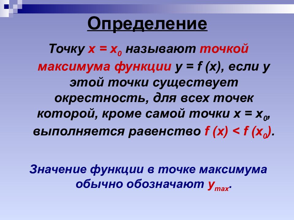 Точку x = x 0 называют точкой максимума функции y = f (x), если у этой точки существует окрестность, для всех точек которой, кроме самой точки x = x 0, выполняется равенство f (x) < f (x 0 ). Значение функции в точке максимума обычно обозначают y max.