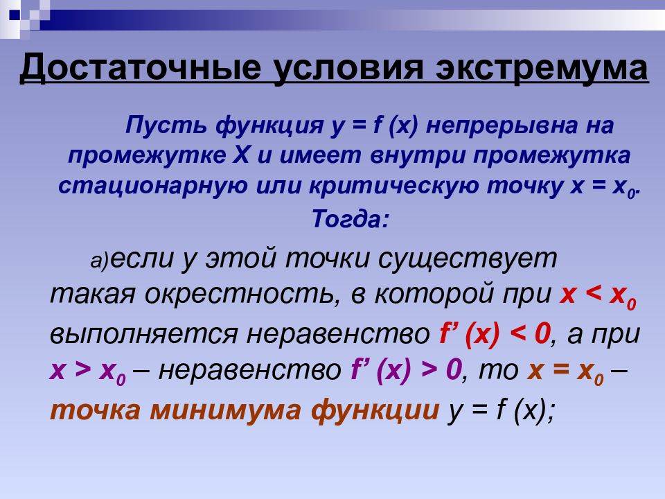 Пусть функция y = f (x) непрерывна на промежутке X и имеет внутри промежутка стационарную или критическую точку x = x 0. Тогда: если у этой точки существует такая окрестность, в которой при x < x 0 выполняется неравенство f’ (x) < 0, а при x > x 0 – неравенство f’ (x) > 0, то x = x 0 – точка минимума функции y = f (x) ;