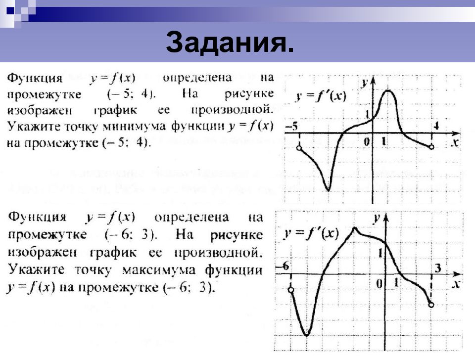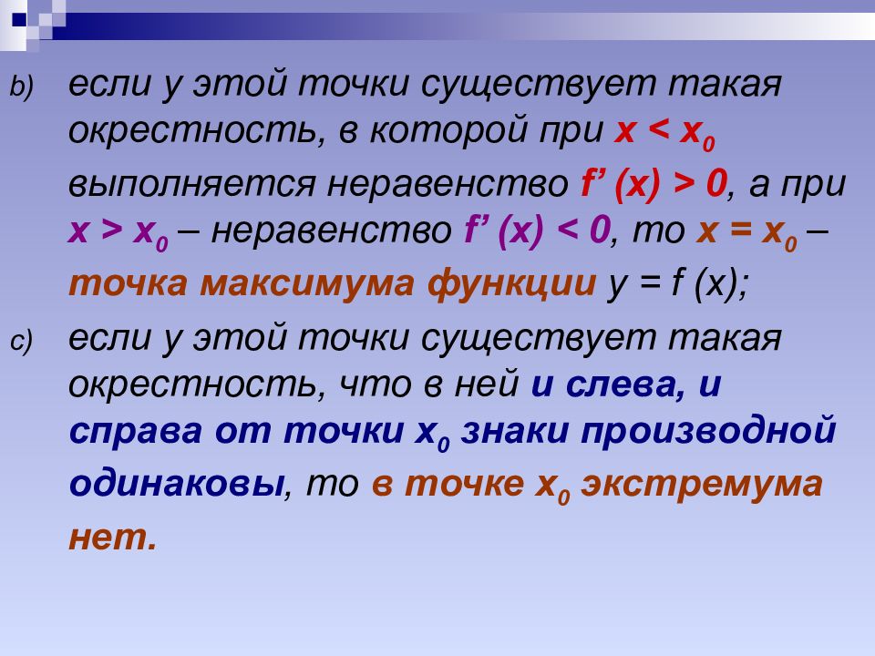 если у этой точки существует такая окрестность, в которой при x < x 0 выполняется неравенство f’ (x) > 0, а при x > x 0 – неравенство f’ (x) < 0, то x = x 0 – точка максимума функции y = f (x) ; если у этой точки существует такая окрестность, что в ней и слева, и справа от точки x 0 знаки производной одинаковы, то в точке x 0 экстремума нет.