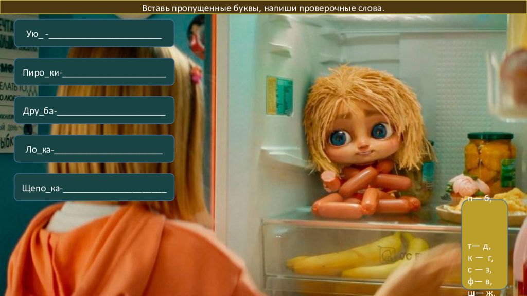 Вставь пропущенные буквы, напиши проверочные слова. Ую _ -_______________________ Пиро_ки -_____________________ Дру_ба -______________________ Ло_ка -______________________ Щепо_ка -_____________________ п— б, т— д, к — г, с — з, ф— в, ш— ж,