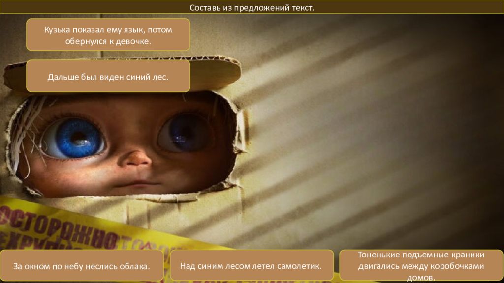 Тоненькие подъемные краники двигались между коробочками домов. Составь из предложений текст. За окном по небу неслись облака. Над синим лесом летел самолетик. Кузька показал ему язык, потом обернулся к девочке. Дальше был виден синий лес.
