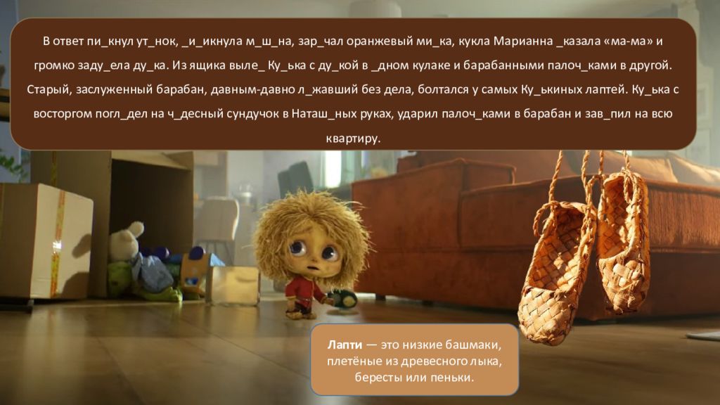 В ответ пи_кнул ут_нок, _ и_икнула м_ш_на, зар_чал оранжевый ми_ка, кукла Марианна _казала « ма-ма » и громко заду_ела ду_ка. Из ящика выле _ Ку_ька с ду_кой в _дном кулаке и барабанными палоч_ками в другой. Старый, заслуженный барабан, давным-давно л_жавший без дела, болтался у самых Ку_ькиных лаптей. Ку_ька с восторгом погл_дел на ч_десный сундучок в Наташ_ных руках, ударил палоч_ками в барабан и зав_пил на всю квартиру. Лапти — это низкие башмаки, плетёные из древесного лыка, бересты или пеньки.