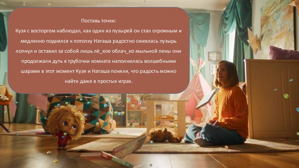 Поставь точки: Кузя с восторгом наблюдал, как один из пузырей он стал огромным и медленно поднялся к потолку Наташа радостно смеялась пузырь лопнул и оставил за собой лишь лё_кое облач_ко мыльной пены о ни продолжали дуть в трубочки комната наполнилась волшебными шарами в этот момент Кузя и Наташа поняли, что радость можно найти даже в простых играх.