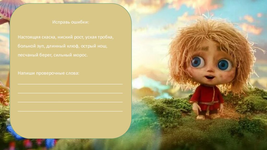 Исправь ошибки: Настоящяя скаска, ниский рост, уская тробка, больной зуп, длинный клюф, острый нош, песчаный берег, сильный морос. Напиши проверочные слова: ________________________________________________________________________________________________________________________________________________________________________